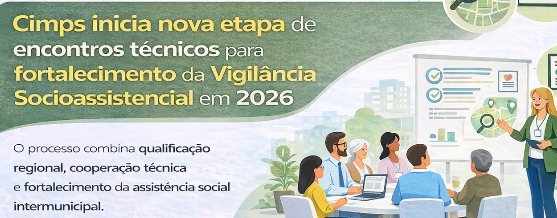 O Consórcio Intermunicipal de Políticas Sociais (Cimps) inicia, no final de janeiro e início de fevereiro de 2026, uma nova etapa de encontros técnicos voltados ao fortalecimento da Vigilância Socioassistencial nos municípios consorciados.